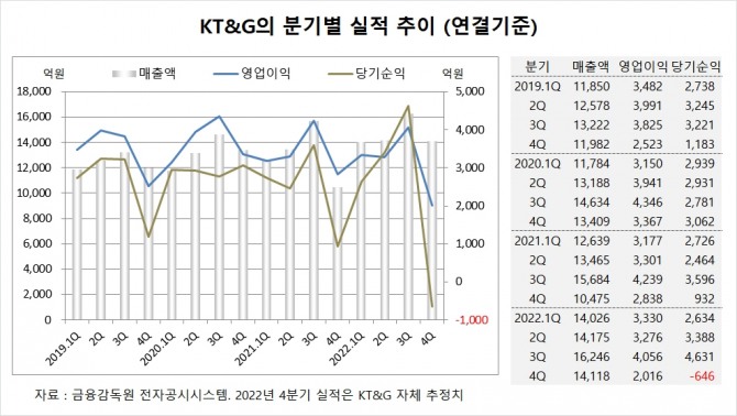 KT&G는 지난해 4분기 실적을 잠정 집계한 결과 연결기준 매출액이 1조4118억원, 영업이익이 2016억원, 당기순이익이 –646억원에 이를 것이라고 공시했습니다. KT&G의 작년 4분기 영업이익은 시장 컨센서스인 2786억원을 27% 가량 하회했습니다.