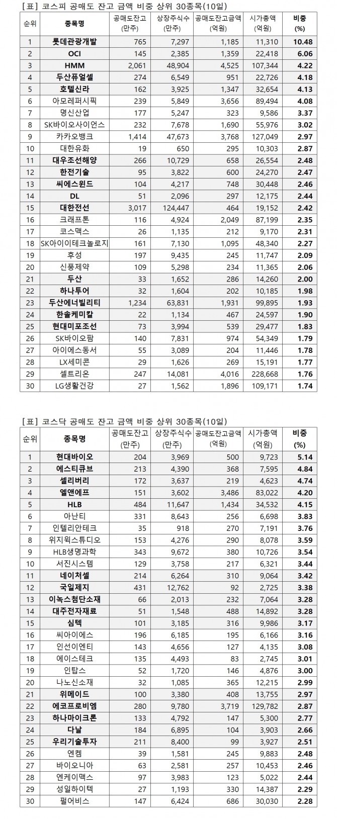 15일 한국거래소에 따르면 지난 10일 기준 유가증권시장과 코스닥시장에서 시가총액 대비 공매도 잔고금액 비중 상위 종목은 다음과 같다.