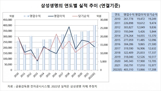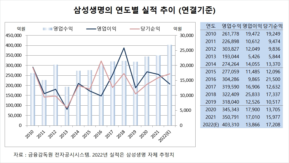 삼성생명은 지난해 실적을 잠정 집계한 결과 연결기준 영업수익(매출액)이 40조3310억원, 영업이익이 1조3866억원, 당기순이익이 1조7208억원에 이를 것이라고 공시했습니다. 2022년 순익은 전년도에 비해 7.7% 증가했습니다.