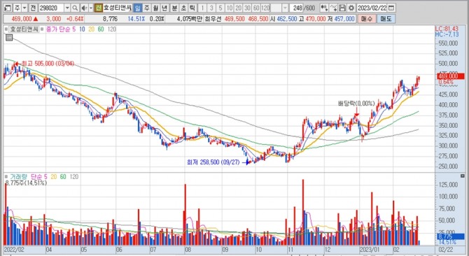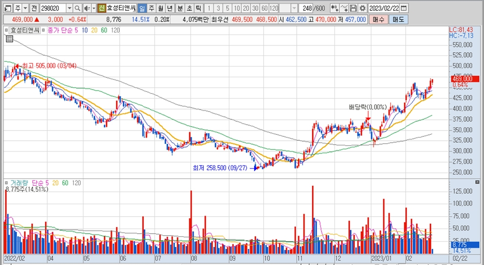 IBK투자증권은 효성티앤씨가 중국 리오프닝 효과로 중국 수요 증가 및 중국의 역내/외향 수출 감소가 발생하는 가운데 주요 원재료의 저가 투입 효과(래깅 1~2개월)가 발생해 전 사업부문 실적 개선이 전망돼 효성티앤씨에 대해 투자의견 매수를 유지하나 목표주가를 기존 56만원에서 60만원으로 상향조정했습니다.