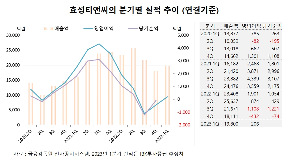 IBK투자증권은 효성티앤씨의 올해 1분기 연결기준 매출액이 1조9800억원, 영업이익이 206억원에 이를 것으로 전망하고 있습니다.