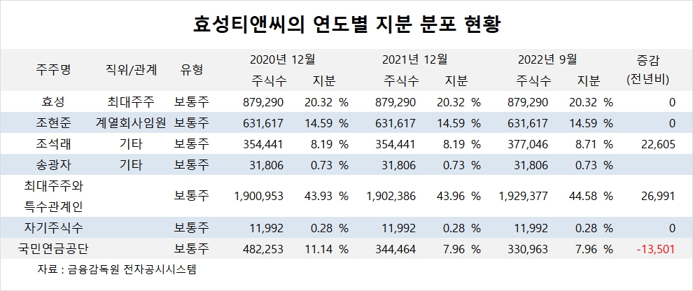 이미지 확대보기효성티앤씨의 최대주주는 지주회사인 효성으로 지분 20.32%를 보유하고 있습니다.