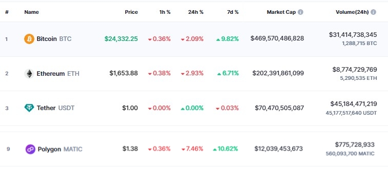 이미지 확대보기종종 '이더리움 킬러'로 불렸던 폴리곤은 지난 2021년 12월 27일 사상 최고치인 2.92달러를 기록했다. 22일 오전 10시 40분 현재 코인마켓캡에서 폴리곤의 자체 토큰 MATIC 코인은 전일 대비 7.46% 급락한 1.38달러에 거래됐다. 시가총액은 120억달러로 9위를 차지했다.