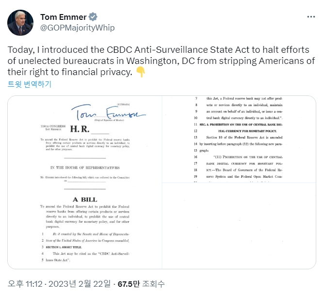 에머 의원은 법안을 발표하는 트윗에서 "달러의 어떤 디지털 버전도 사생활, 개인 주권, 자유 시장 경쟁력이라는 미국의 가치를 지지해야 한다. 그보다 못한 것은 위험한 감시 도구 개발의 문을 열어준다"고 덧붙였다.