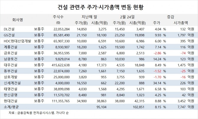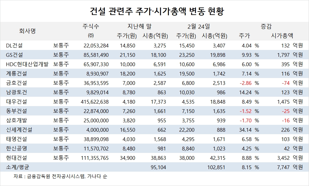 주요 건설사 상장종목 시가총액은 지난해 말 9조5104억원에서 2월 24일 10조2851억원으로 8.15%(7747억원) 증가한 것으로 조사됐습니다.
