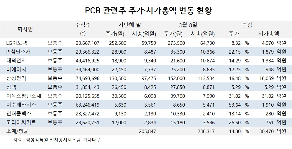 주요 상장 PCB 업체들의 시가총액은 지난해 말 20조5847억원에서 3월 8일 23조6317억원으로 14.80%(3조470억원) 뛰었습니다.
