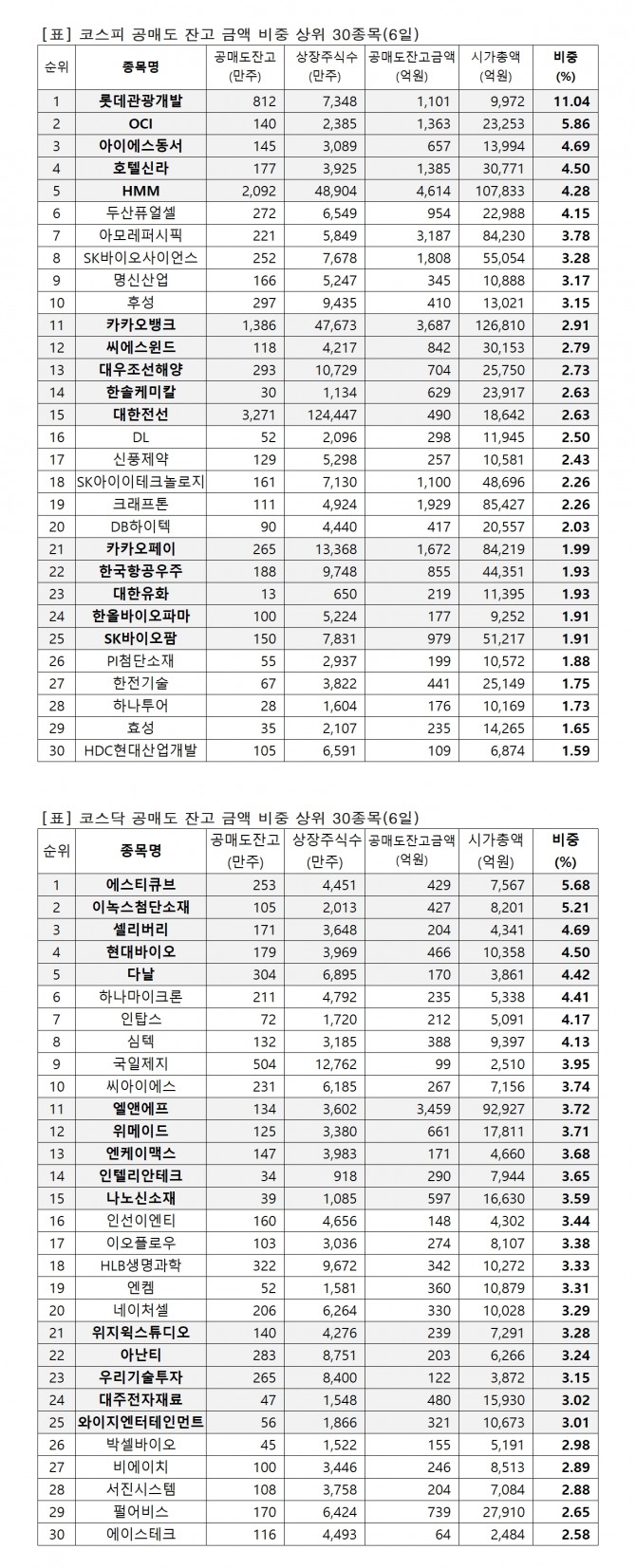 9일 한국거래소에 따르면 지난 6일 기준 유가증권시장과 코스닥시장에서 시가총액 대비 공매도 잔고금액 비중 상위 종목은 다음과 같다.