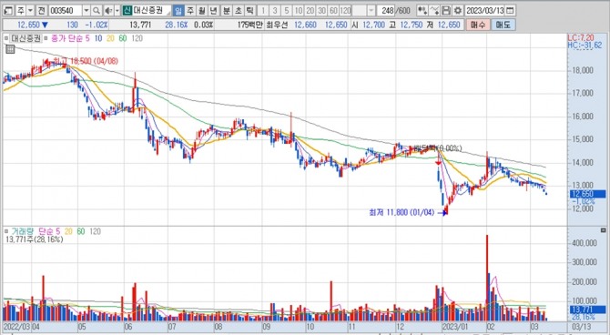 이미지 확대보기대신증권의 주가는 13일 오전 9시 20분 현재 전일보다 130원(1.02%) 내린 1만2650원에 매매되고 있습니다.