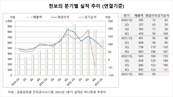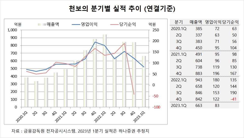 천보는 지난해 4분기 실적을 잠정 집계한 결과 연결기준 매출액이 842억원, 영업이익이 122억원, 당기순이익이 –41억원을 기록했다고 공시했습니다.