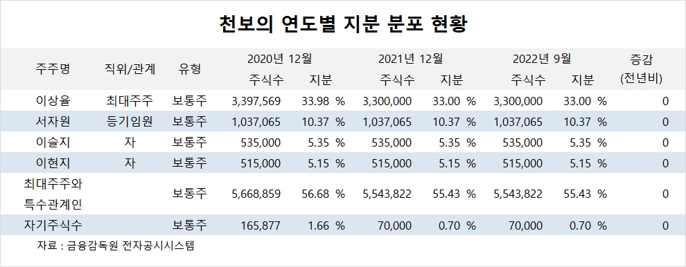 이미지 확대보기천보의 최대주주는 이상율 대표로 지분 33.0%를 보유하고 있습니다.
