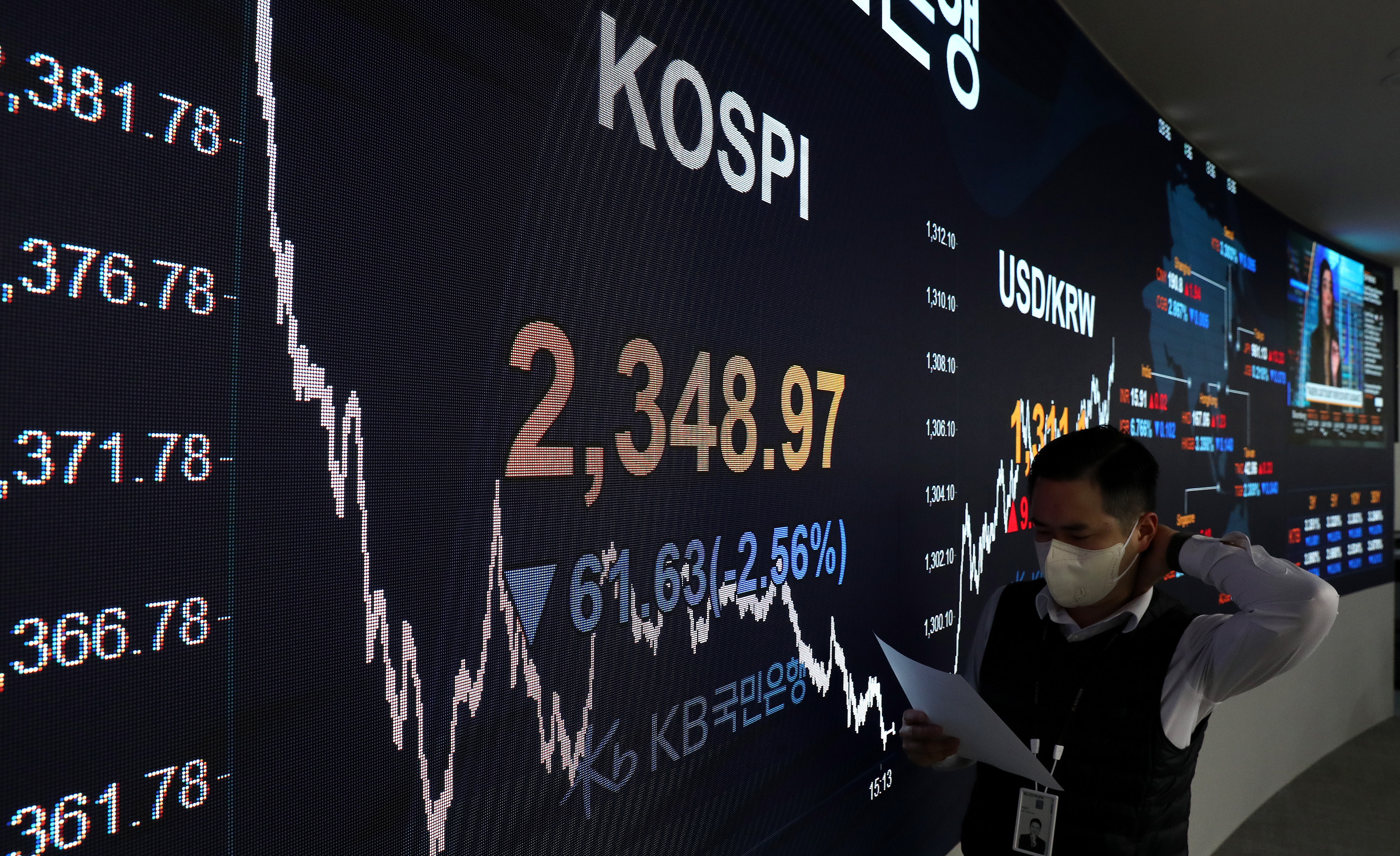 이미지 확대보기14일 한국거래소에 따르면 이날 코스피는 전 거래일 대비 2.56%(61.63포인트) 떨어진 2348.97에 거래를 마감했다.