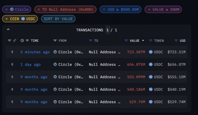 더블록은 아캄 인텔리전스 데이터를 인용해 15일 새벽 아시아 시간대 단일 거래에서 약 7억 2300만 USDC가 소각됐다고 전했다.