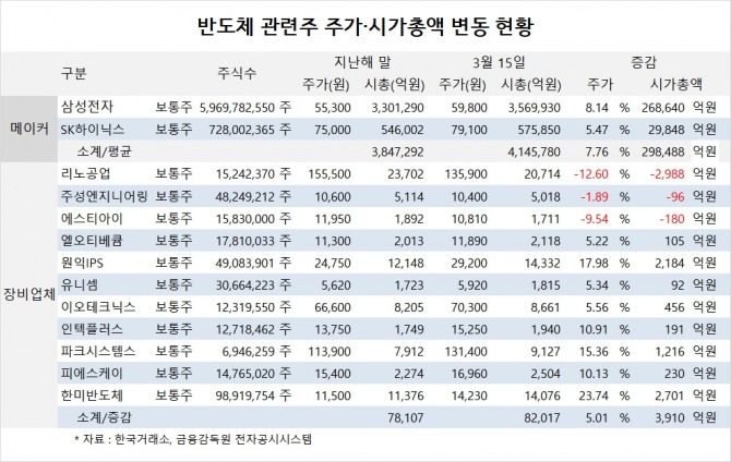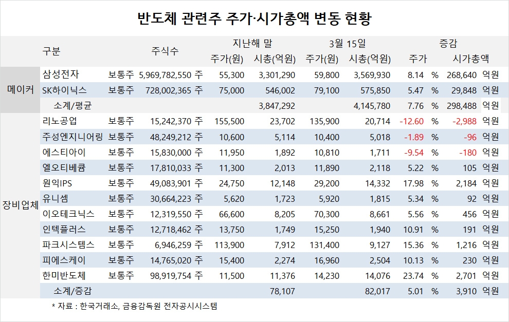 주요 반도체 장비업체들의 시가총액은 지난해 말 7조8107억원에서 15일 8조2017억원으로 5.01%(3910억원) 증가했습니다.