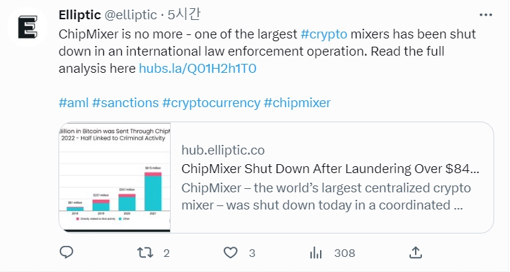 엘립틱은 블로그 게시물에서 칩믹서가 사이버 보안 전문가와 서방 국가들이 북한에서 운영한다고 주장하는 해킹 조직인 라자루스 그룹이 저지른 해킹 수익금을 세탁하는 데 사용된 여러 믹서 중 하나라고 밝혔다.