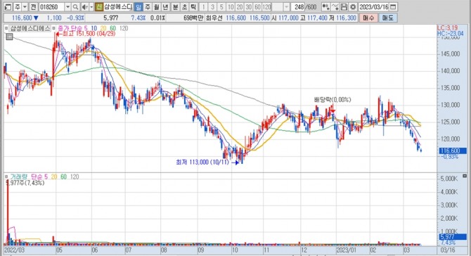 이미지 확대보기삼성SDS의 주가는 16일 오전 9시 10분 현재 전일보다 1100원(0.93%) 내린 11만6600원에 매매되고 있습니다.