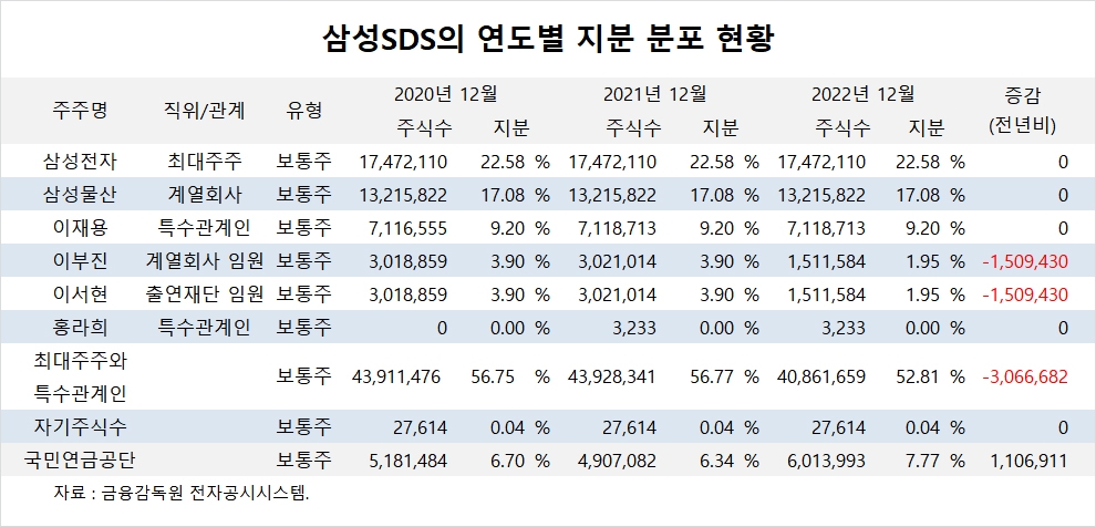 이미지 확대보기삼성SDS의 최대주주는 삼성전자로 지분 22.58%를 보유하고 있습니다.