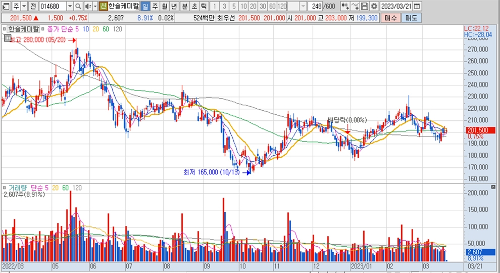 이미지 확대보기한솔케미칼의 주가는 21일 오전 9시 30분 현재 전일보다 1500원(0.75%) 오른 20만1500원에 거래되고 있습니다.