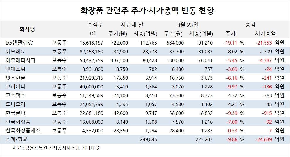 주요 화장품주의 시가총액은 지난해 말의 24조9845억원에서 3월 23일 22조5207억원으로 9.86%(2조4639억원) 감소한 것으로 집계됐습니다.