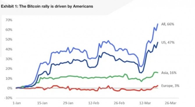 최근 비트코인 랠리를 살펴보면 미국 투자자들이 가격 상승에 큰 역할을 했다는 것을 알 수 있다. 매트릭스포트의 연구 및 전략 책임자 마르쿠스 틸린은 "미국인들이 양손으로 비트코인을 구매하고 있다"고 말했다. 틸린은 비트코인 가격 상승을 이끈 구매의 47%가 미국 기관 투자자들로부터 나왔다고 언급했다.