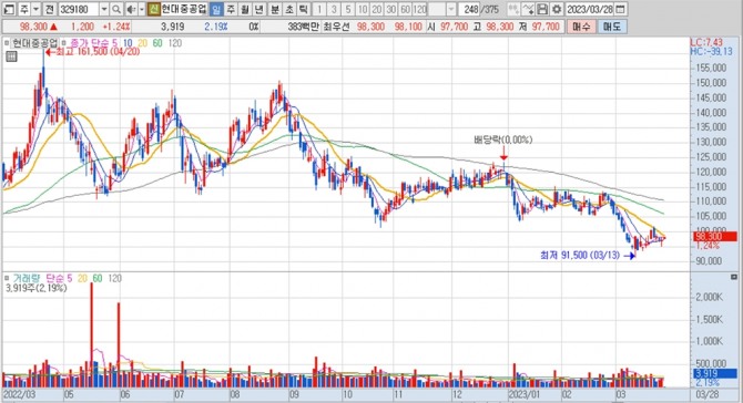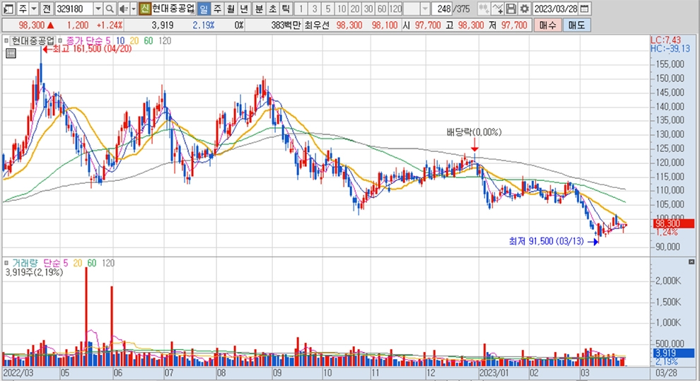 이미지 확대보기현대중공업의 주가는 28일 오전 9시 3분 현재 전일보다 1200원(1.24%) 오른 9만8300원에 거래되고 있습니다.