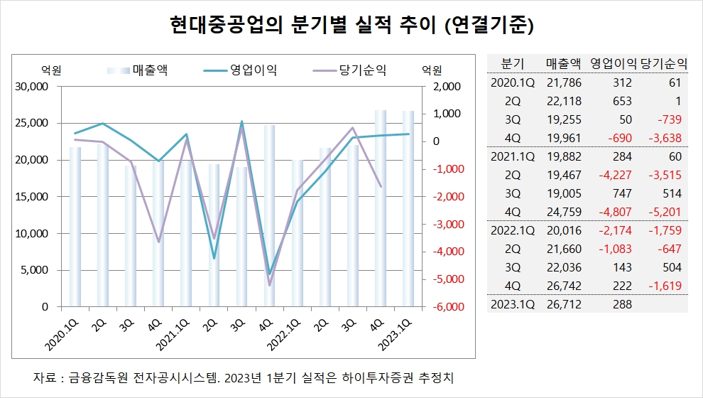 하이투자증권은 현대중공업의 올해 1분기 연결기준 매출액이 2조6712억원, 영업이익이 288억원에 이를 것으로 전망하고 있습니다.