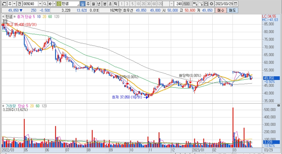 이미지 확대보기한샘의 주가는 29일 오전 9시 30분 현재 전일보다 250원(0.50%) 내린 4만9850원에 거래되고 있습니다.