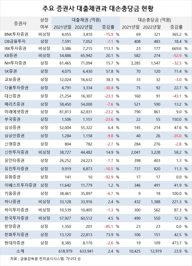 교보증권의 지난해 말 대출채권과 대손충당금은 각각 1조6632억원과 32억원, 다올투자증권이 각각 3334억원과 92억원, 대신증권이 각각 1조6307억원과 91억원, 메리츠증권이 각각 5조4000억원과 590억원, 미래에셋증권이 6조2831억원과 861억원, 부국증권이 각각 1151억원과 55억원을 기록했습니다.