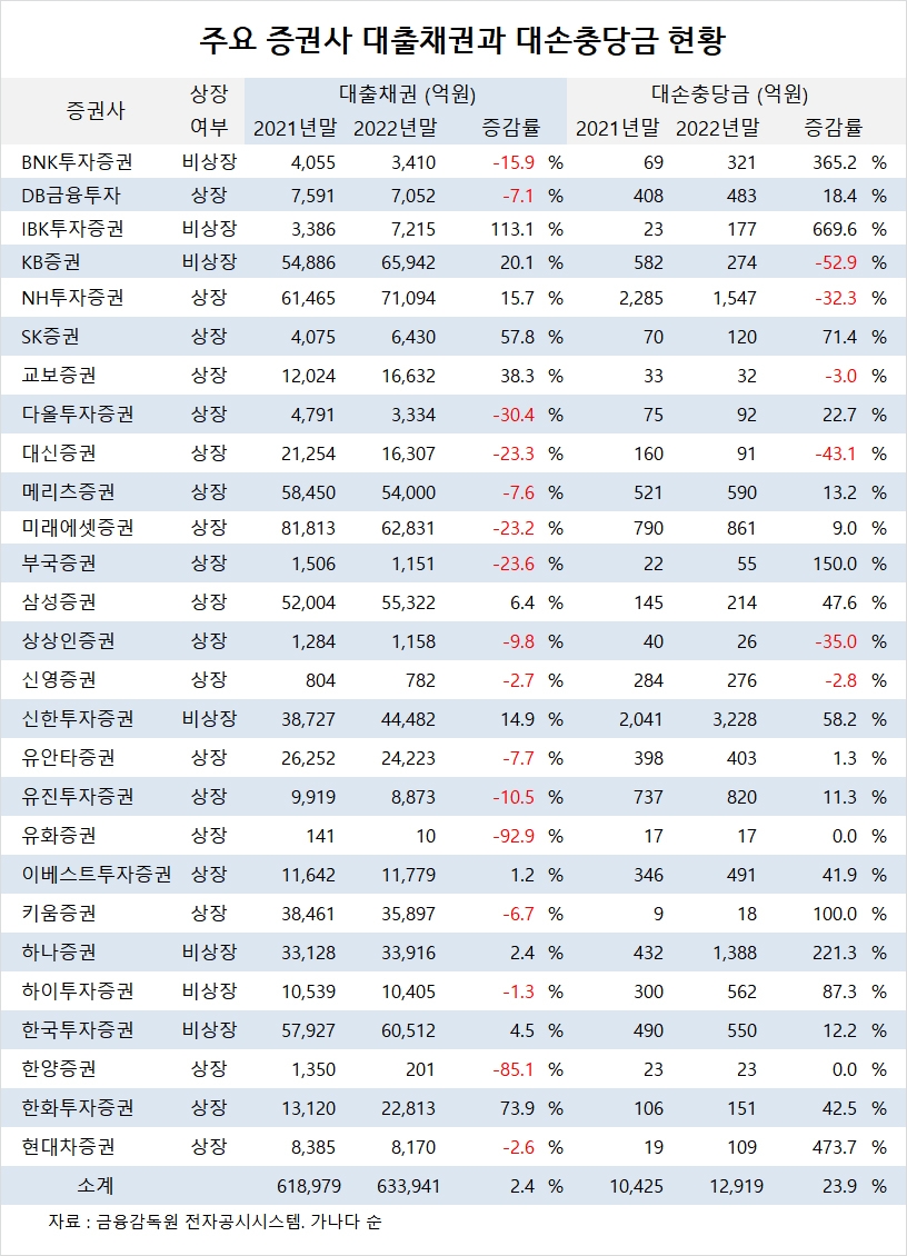 글로벌이코노믹이 조사한 국내 주요 증권사 27곳의 지난해 말 대출채권은 63조3941억원 상당으로 전년의 61조8979억원보다 2.4% 증가한 것으로 나타났습니다. 반면 지난해 말 대손충당금은 1조2919억원 규모로 전년의 1조425억원에 비해 23.9% 급증한 것으로 집계됐습니다.