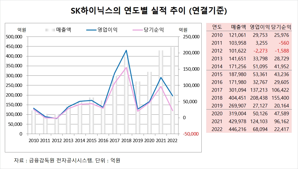 이미지 확대보기SK하이닉스는 지난해 연결기준 매출액이 44조6216억원, 영업이익이 6조8094억원, 당기순이익이 2조2417억원으로 집계됐습니다.