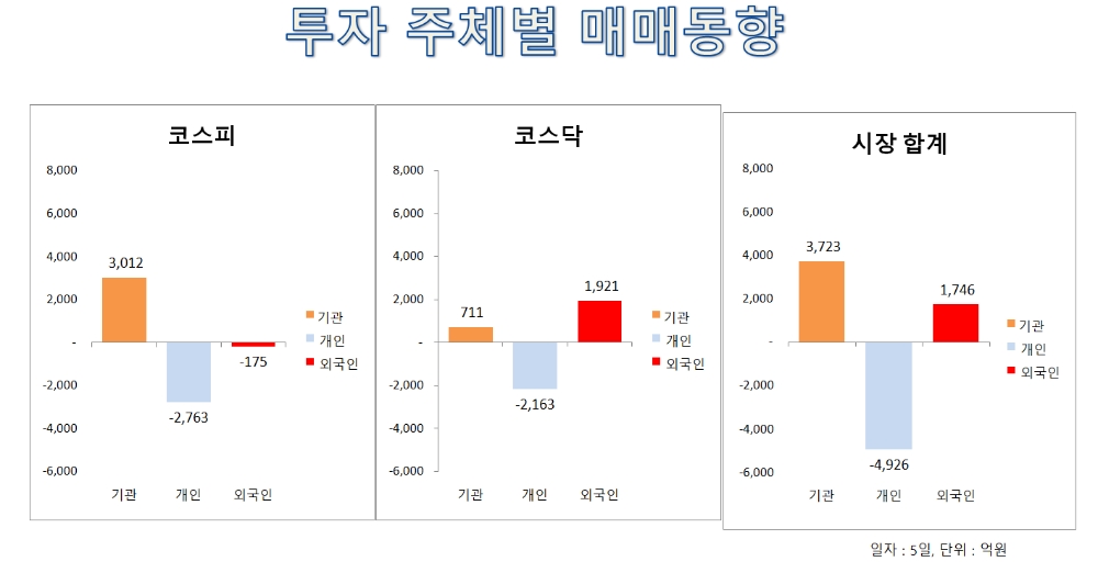 다음은 지난 5일 기준 주요 투자주체의 시장별 순매수와 순매도 상위종목이다.