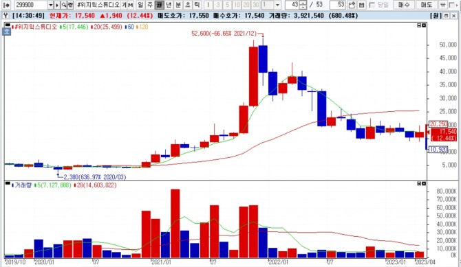 한편, 위지윅스튜디오 주가는 오후 2시 37분 현재 무상증자 결정 공시의 영향으로 전 거래일 보다 12.18% 상승한 1만7500원에 거래되고 있다.