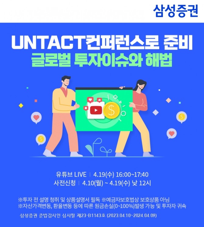 이미지 확대보기17일 삼성증권에 따르면, 이번 언택트컨퍼런스는 이달 19일 수요일 오후 4시부터 5시 40분까지 삼성증권 유튜브(SamsungPOP)에서 실시간으로 진행될 예정이다.