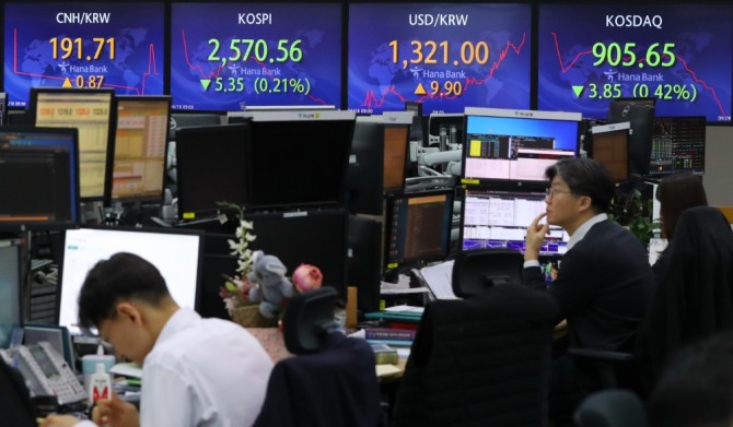 이미지 확대보기18일 한국거래소에 따르면 오전 9시 45분 현재 코스피는 전 거래일 대비 0.38%(9.78포인트) 떨어진 2566.13을 기록하고 있다.