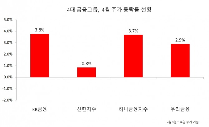 이날 KB금융은 지난달 22일 이후 처음으로 시가총액 20조원을 탈환했다. 이달 주가 상승률은 3.8%로 가장 높다. 신한지주에 비해 4.75배 더 높은 상승률을 기록하고 있다.