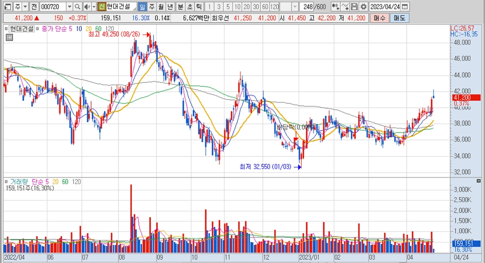 이미지 확대보기현대건설의 주가는 24일 오전 9시 10분 현재 전일보다 150원(0.37%) 오른 4만1200원에 매매되고 있습니다.