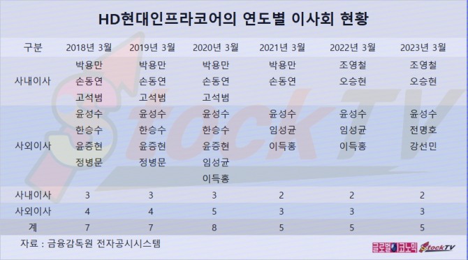 HD현대인프라코어 이사회는 올해 3월말 기준으로 사내이사 2명과 사외이사 3명 등 모두 5명으로 구성되어 있습니다.