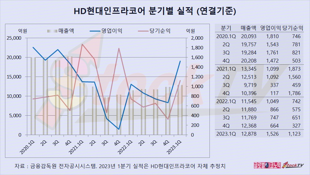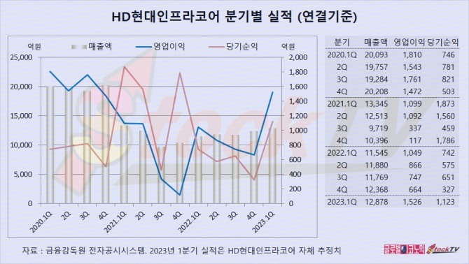 HD현대인프라코어는 2023년 1분기 연결기준 매출액이 1조2878억원으로 전년동기보다 12% 증가했습니다.