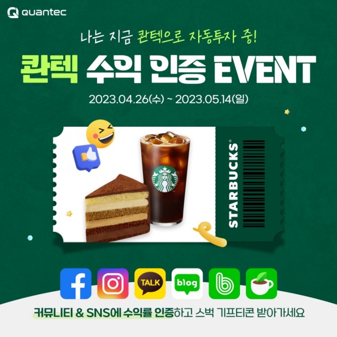 이미지 확대보기이벤트는 콴텍 상품을 가입하고 운용 중인 고객이라면 누구나 참여 가능하다. 본인의 수익률 화면을 캡처해 필수 해시태그 '#수익인증이벤트'와 함께 네이버 블로그, 카페, 인스타그램, 페이스북 등 각종 SNS, 커뮤니티 채널에 공유한 후 카카오톡 채널 '콴텍 고객센터'로 메시지를 보내면 된다.