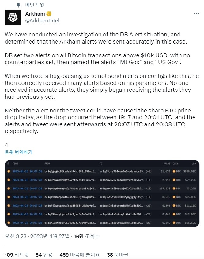 이미지 확대보기아캄의 주장은 26일 오후 퍼스트리퍼블릭은행 위기로 비트코인이 9% 이상 급등해 3만 달러 도달에 임박한 뒤 1시간 동안 갑자기 7% 폭락해 2만7000달러 수준으로 떨어진 원인이 마운트곡스와 미국 정부 주소가 활성화됐다는 아캄의 경고 직후에 벌어진 일이라는 논란이 불거진 가운데 나온 것이다.