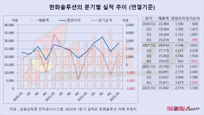 한화솔루션은 2023년 1분기 연결기준 영업이익이 2714억원으로 전년동기보다 72% 급증했고 당기순이익은 1334억원으로 전년동기에 비해 29% 불었습니다.