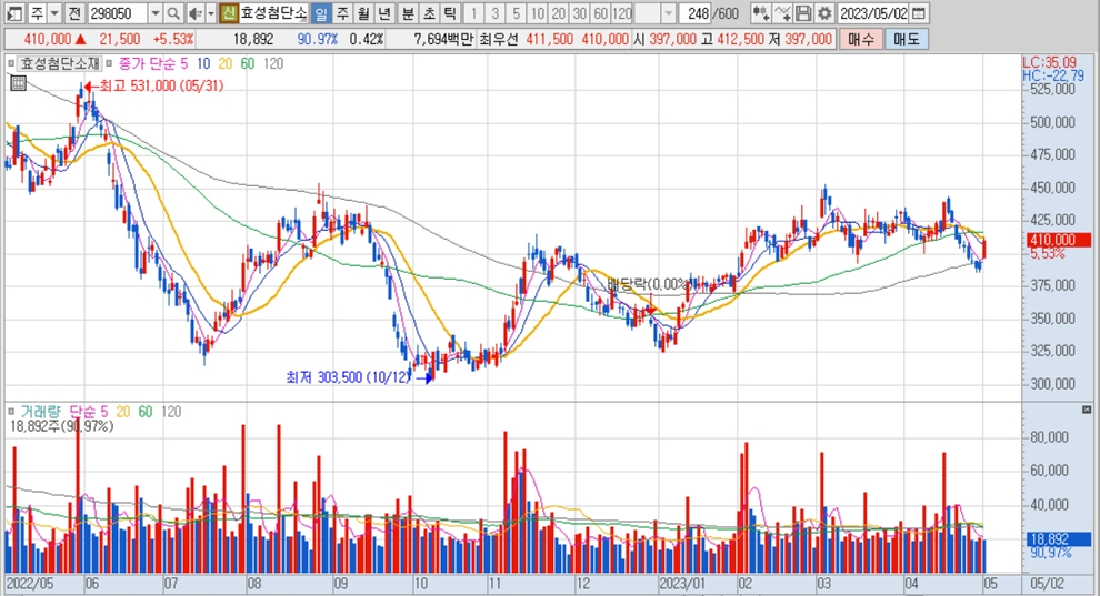 이미지 확대보기효성첨단소재의 주가는 2일 오전 9시 40분 현재 전일보다 2만1500원(5.53%) 오른 41만원에 거래되고 있습니다.