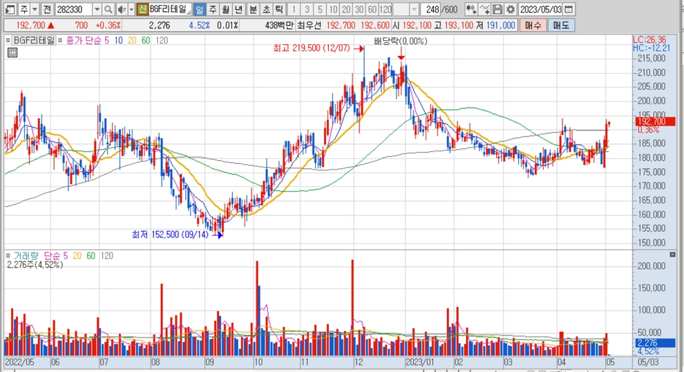 이미지 확대보기BGF리테일의 주가는 3일 오전 9시 20분 현재 전일보다 700원(0.36%) 오른 19만2700원에 매매되고 있습니다.