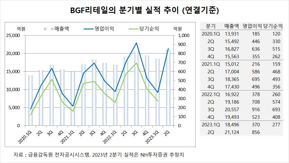 NH투자증권은 BGF리테일의 올해 2분기 연결기준 매출액이 2조1124억원, 영업이익이 856억원에 이를 것으로 전망하고 있습니다.