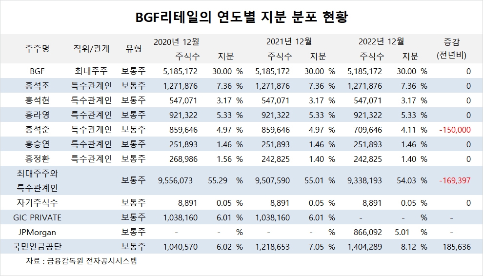 이미지 확대보기BGF의 최대주주는 홍석조 회장으로 지분 32.40%를 갖고 있습니다.