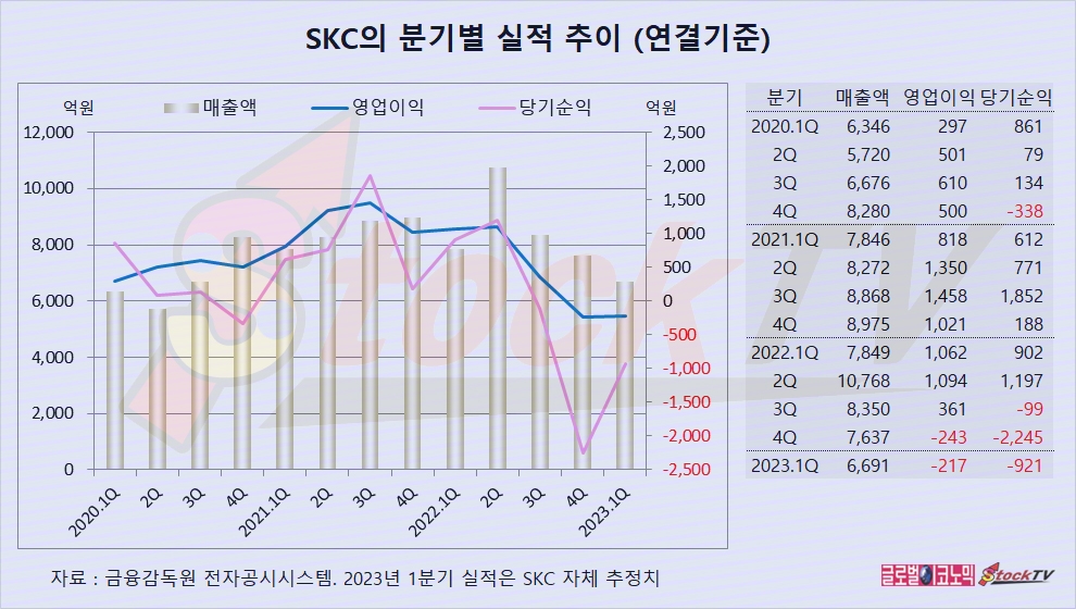 SKC는 1분기 연결기준 영업이익이 -217억원으로 전년동기 흑자에서 적자로 전환했고 당기순이익이 -921억원으로 전년동기 흑자에서 적자로 돌아섰습니다.