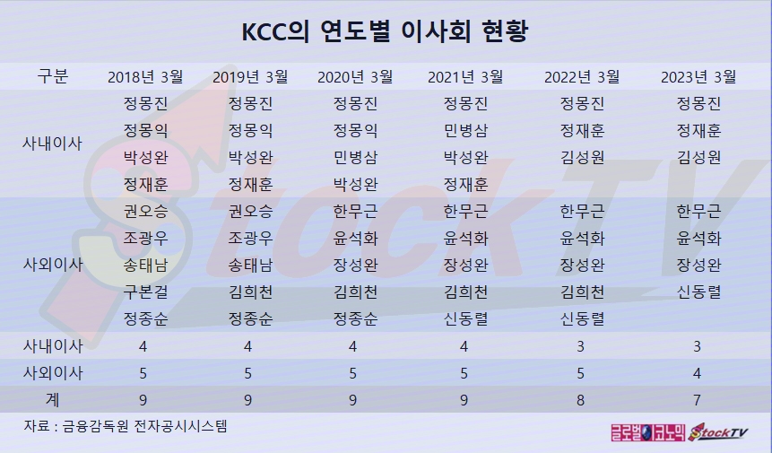KCC 이사회는 2023년 3월 기준으로 사내이사 3명, 사외이사 4명 등 모두 7명으로 구성되어 있습니다.