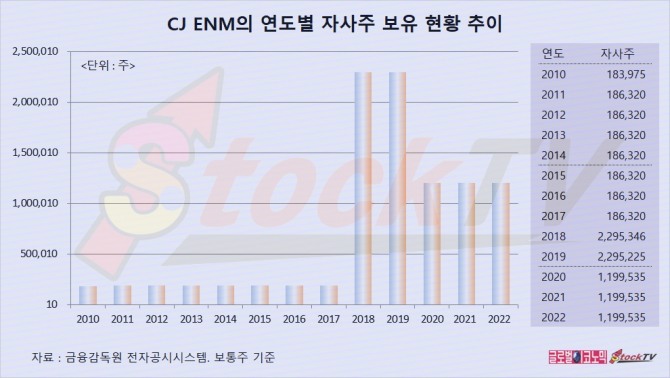 CJ ENM은 지난 2018년 CJ오쇼핑과의 합병으로 주식매수청구권 행사 주식 229만5346주를 취득했고 기존의 18만6320주는 소각해 자기주식이 229만5346주로 불었습니다.