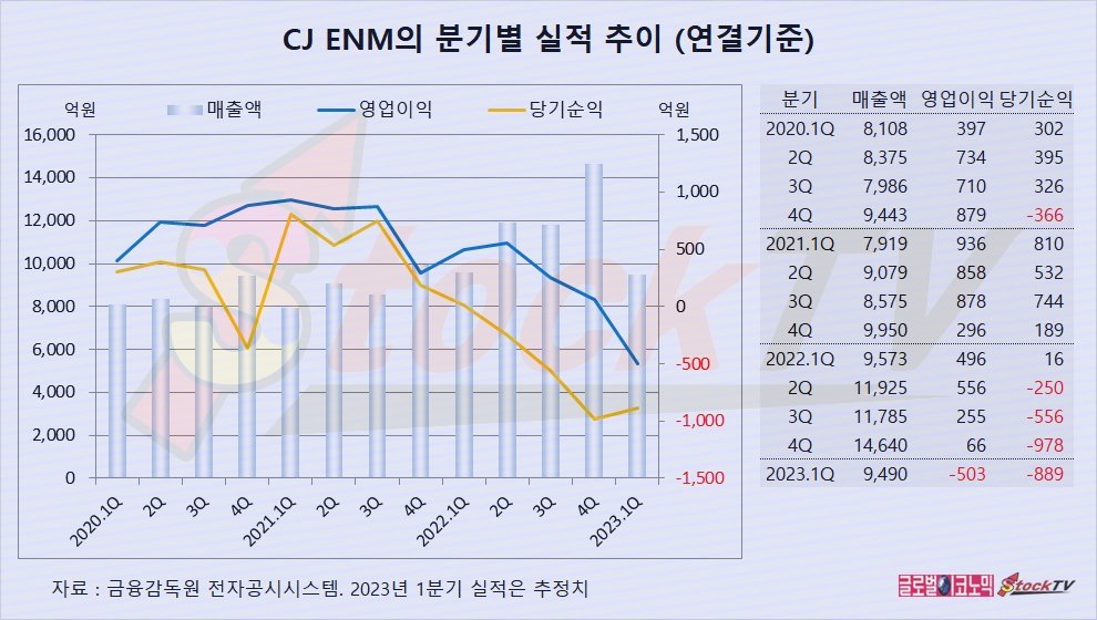 CJ ENM은 1분기 연결기준 영업이익이 -503억원으로 전년동기 흑자에서 적자로 전환했고 당기순이익은 -889억원으로 4개 분기째 적자가 이어지고 있습니다.