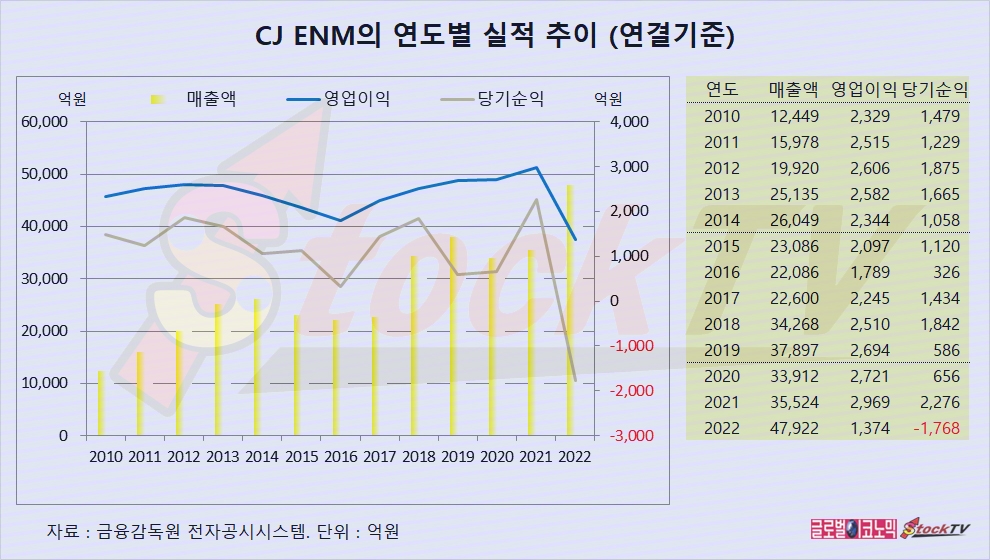 CJ ENM의 연도별 실적은 매출액이 꾸준하게 늘고 있으나 수익성은 급격하게 저하되고 있습니다.