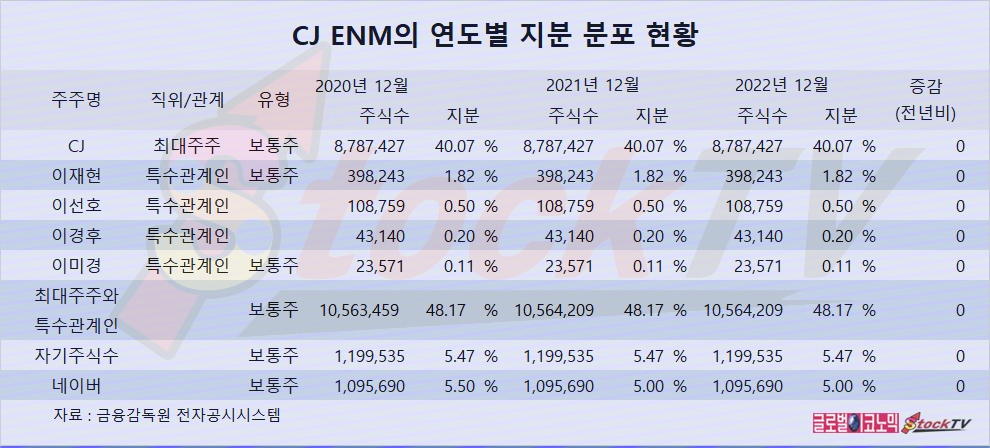 CJ ENM은 네이버가 지분 5.0%를 갖고 있습니다.